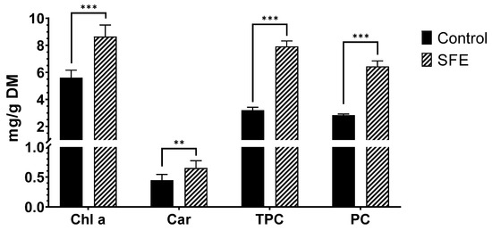 - Esquivel-Hernández, D.A.; López, V.H.; Rodríguez-Rodríguez, J.; Alemán-Nava, G.S.; Cuéllar-Bermúdez, S.P.; Rostro-Alanis, M.; Parra-Saldívar, R. Supercritical carbon dioxide and microwave-assisted extraction of functional lipophilic compounds from Arthrospira platensis. Int. J. Mol. Sci. 2016, 17, 658. [Google Scholar] [CrossRef] [PubMed]