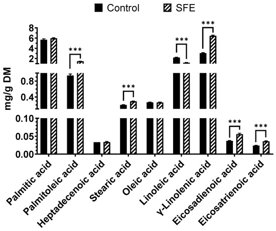 | γ-Linolenic acid | C18:3n-6 | 20.66 ± 0.01 | 36.49 ± 1.88 *** |