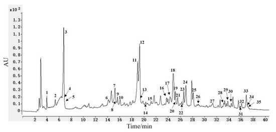 Peaks 16, 18, 20, 21, 22, 23, 24, 25, 27, 28, 30, 31, and 35 in Figure 1 were inferred to be flavonols and their glycosides. Peak 16 was identified as rutin (13) by the fragment ions (m/z 308 [glucosyl + rhamnosyl]−, 301 [quercetin]−), tR (23.79 min) and UV absorption (λmax 216, 257, 354 nm). Likewise, peaks 18 (m/z 301 [quercetin]−; tR 24.85 min; λmax 210, 257, 354 nm), 21 (m/z 447 [M − rhamnosyl]−, 285 [447 − glucosyl]−; tR 25.63 min, λmax 260, 302, 362 nm), 22 (m/z 302 [quercetin]−; tR 26.31 min), 23 (m/z 593 [M − H]−; tR 26.62 min; λmax 210, 257, 350 nm), 24 (m/z 285 [M − H − glucosyl]−; tR 27.16 min; λmax 226, 264, 348 nm), 25 (m/z 285 [M − H − galactosyl]−; tR 28.21 min; λmax 210, 266, 347 nm), 27 (m/z 285 [M − H − rhamnosyl]−; tR 31.45 min; λmax 210, 264, 343 nm), 31 (m/z 447 [M − 2H − coumaroyl]−, 285 [447 − glucosyl]−; tR 35.95 min; λmax 210, 266, 315 nm) and 35 (m/z 301 [M − H]−; tR 37.24 min; λmax 210, 256, 371 nm) were recognized as quercetin 3-O-β-D-glucopyranoside (11), kaempferol 3-O-rutinoside (12), quercetin 3-(2″-β-D-glucosy-l)-α-L-rhamnopyranoside (17), kaempferol 3-(2″-β-D-glucosyl)-α-L-rhamnopyranoside (18), kaempherol 3-O-β-D-glucopyranoside (9), kaempherol 3-O-β-D-galacopyranoside (14), kaempherol 3-O-α-L-rhamnopyranoside (15), kaempferol 3-O-(6″-trans-p-coumaroy-l)-β-D-glucopyranoside (10), and quercetin (16), respectively, and they were also isolated from further chemical study. In addition, peaks 20 (m/z 463 [M − H]−; tR 25.25 min), 28 (m/z 755 [M − H − rhamnosyl]−, 447 [M − H − glucosyl − coumaroyl]−; tR 33.19 min), 30 (m/z 739 [M − H − rhamnosyl]−, 577 [739 − glucosyl]−, 431 [577 − H − coumaroyl]−, 285 [431 − rhamnosyl]−; tR 34.28 min), were speculated to be quercetin 3-O-β-D-galactopyranoside, quercetin-3-O-coumaroyl-rhamnosyl-glucosyl-rhamnopyranoside, and kaempferol-3-O-coumaroyl-rhamnosyl-glucosyl-rhamnopyranoside, respectively.