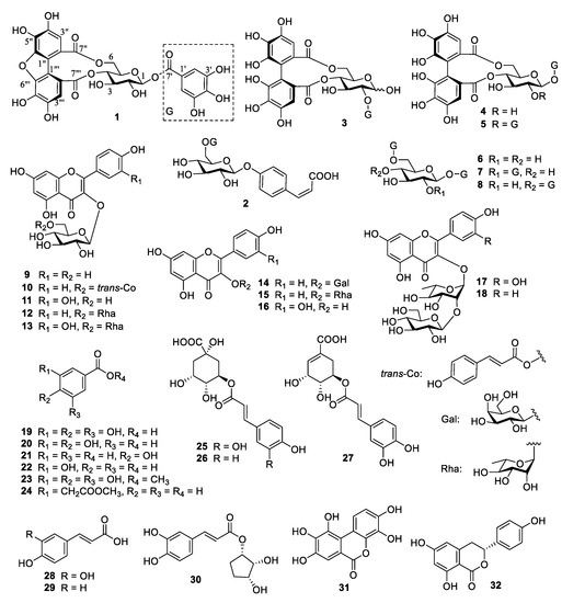 Urolithins, as natural metabolites of ETs with better gastrointestinal absorption, were reported to have inhibitory effects on the proliferation of prostate and colon cancer cells as well as anti-inflammation activity [56]. It is reported that ETs were hydrolyzed by intestinal bacteria to produce ellagic acid, which were subsequently converted into urolithins. The presence of compound 31 (resembled a urolithin) demonstrated a possible occurrence of the ester hydrolysis of ET acyl groups and further decarboxylation during the fermentation of black tea made from the leaves of C. taliensis.