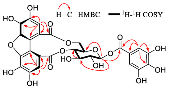 Compound 1 was obtained as a yellow-brown amorphous powder with +34.4 (c 0.10, MeOH) (Figure S9). Its molecular formula, C27H20O17, was deduced from HRESI-MS at m/z 615.0625 [M − H]− (calculated for 615.0628) (Figure S7), demonstrating 18 degrees of unsaturation. Detailed analysis of the NMR data revealed that 1 had a great semblable structure to that of strictinin (4) (Figures S1 and S2). The existence of one glucosyl (δC 95.7, 76.7, 74.9, 74.2, 71.7, 67.6; δH 5.73, 1H, d, J = 8.2 Hz) with C1 form proved by the study on the conformation of ellagitannins (ETs) [50] and the large coupling constant (J = 8.2 Hz) of anomeric proton (δH 5.73) [51], one galloyl (δC 146.6 (2C), 140.6, 120.4, 110.6 (2C), 166.8; δH 7.12, 2H, s), and one HHDP-related acyl (δC 147.7, 147.6, 145.5, 145.2, 136.1, 134.0, 119.8, 117.0, 116.2, 115.9, 115.4, 112.1, 171.5, 170.0; δH 7.20, 7.05. each 1H, s) groups were deduced apparently from the 1H and 13C NMR spectra (Table 2). The HMBC correlation from the anomeric proton (δH 5.73) to galloyl carboxyl carbon (δC 166.8) clarified that the galloyl group was connected at glucosyl C-1. The obvious lower field shift of glucosyl C-6 (δC 67.6), H-4 (δH 5.00), and H-6 (δH a, 4.78; b, 4.01) compared with those of 1-O-galloyl-β-D-glucopyranose [52], suggested the HHDP-related acyl group should be attached to the glucosyl C-4 and C-6 positions, analogous to those of 4. However, 1H and 13C NMR data assignable the HHDP-related acyl group in 1 were very different to those of the HHDP group in 4, and the molecular formula of 1 was differed from 4 by one H2O, indicating that 1 should be a dehydrated derivative of 4. The HHDP-related acyl group at glucosyl C-6 and C-4 in 1 was determined to be 1,1′-(3,3′,4,4′-tetrahydroxy) dibenzofurandicarboxyl group, compared with the NMR data with those in mallotusinin, the first compound with a 1,1′-(3,3′,4,4′-tetrahydroxy) dibenzofurandicarboxyl group isolated from Mallotus japonicus [53]. Other 2D NMR correlations (Figure 3 and Figure S3–S6) confirmed the structure of 1. Hence, compound 1 was confirmed to be 1-O-galloyl-4,6-tetrahydroxydibenzofurandicarboxyl-β-D-glucopyranose, as shown in Figure 2.
