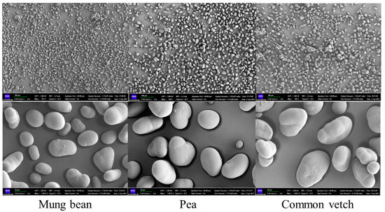 Scanning electron micrographs for common vetch, pea, and mung bean starches. Magnification of 100× and 1000×.