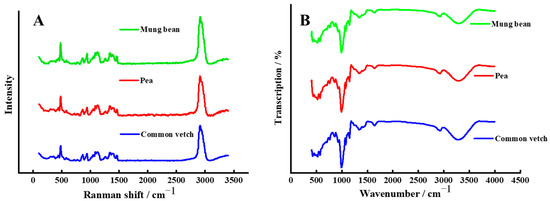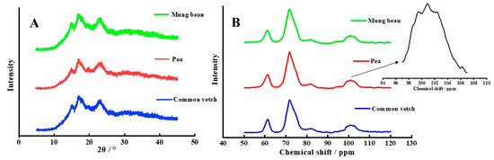 The crystal structure of starch is shown in Table 3 and Figure 2 and Figure 3. As shown in Figure 3A, the common vetch starch, mung bean starch, and pea starch present three obvious peaks at a 2θ value of 15°, 17°, and 23°, indicating a typical crystalline structure of the C-type. However, the crystallinity of common vetch starch was significantly higher than that of mung bean starch and pea starch (p < 0.05). This may be related to the size of starch granules and chain length distribution; larger starch granules predicted higher crystallinity [24,34,38], and the starch with a higher proportion of the A chain length had a higher relative crystallinity [38].