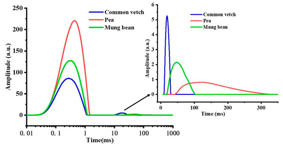 Low-field nuclear magnetic resonance (LF-NMR) is used to determine the water-binding ability of macromolecular substances [41]. The quantification and distribution of water content were defined with rotational relaxation (T2) [26]. And a shorter T2 signal in a rigid or less mobile environment indicates that water was strongly bound and less active [42,43]. As shown in Figure 4 and Table 3, the relaxation peaks of the three starches were mainly at 0.01–1 ms (T21), indicating that the moisture of the three types of starches was mainly bound to water. However, the signal of T21 and the peak area A21 of common vetch starch were significantly lower than those of mung bean starch and pea starch (p < 0.05), indicating that the water binding ability of starch granules was weakest in pea starch and strongest in common vetch starch. These results also suggest that more stable hydrated structures were formed in common vetch starch compared to mung bean starch and pea starch.