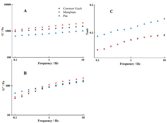 G′, G″, and tan δ as functions of frequency for different starch gels are presented in Figure 5; all the starch gels exhibited higher G′ than G″, behaving as viscoelastic solids, which is consistent with the results obtained with bitter vetch starch [4]. And both G′ and G″ increased with the increase in frequency, which may be due to the formation of small network structures with increasing deformation [49]. Linear regression of the dynamic rheological data of ln G′ and ln G″ versus ln Frequency is presented in Table S1; G″ (slope = 0.215–0.391) showed a much greater dependence on frequency than G′ (slope = 0.092–0.136). As shown in Figure 5C, tan δ of common vetch was lower than 0.1 and similar to that of the mung bean, but tan δ of the pea was higher than 0.1. And the G′ values of the systems were in descending order: mung bean > common vetch > pea. These results indicate that the common vetch starch gel was stronger than the pea starch gel and weaker than the mung bean starch gel [50].