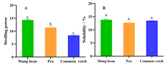 The solubility and swelling power of the three starches are presented in Figure 6A,B. The solubility of common vetch starch was higher than that of mung bean starch and pea starch, but the swelling power of common vetch starch was significantly lower than that of mung bean starch and pea starch (p < 0.05). This may be related to the content of amylose, molecular weight, branching degree, and chain length distribution [51]. Some studies illustrated that the content of amylose had a positive correlation with the SA of starch and a negative correlation with the SP [52], and the larger the molecular weight and granules, the higher the solubility and the lower the swelling degree [53]. These results also showed that the internal structure of the common vetch was more compact than that of the mung bean and pea starch.
