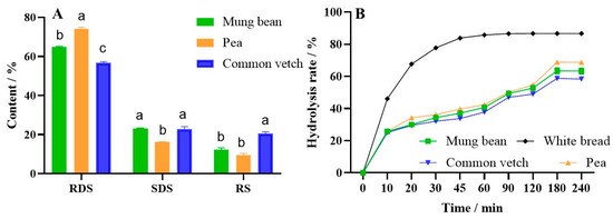 (A) is the result of rapidly digestible starch (RDS), slowly digestible starch (SDS), and resistant starch (RS) content, and (B) is the result of hydrolysis of three starches, where values with different letters are significantly different (p < 0.05).