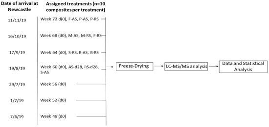 A graphical illustration of the egg sampling for the study. For each batch, eggs were sampled from laying hens of a particular age in order to represent time of lay, starting from week 48 and every 4 weeks thereafter until week 72. Storage conditions tested were ambient storage (AS) and refrigerated storage (RS) at day 28 (d28). The date of arrival at Newcastle University was set at d0, and eggs assigned to processing groups were treated on subsequent experimental days. Cooking conditions tested were scrambling (S), hard-boiling (B), microwaving (M), frying (F) and poaching (P).