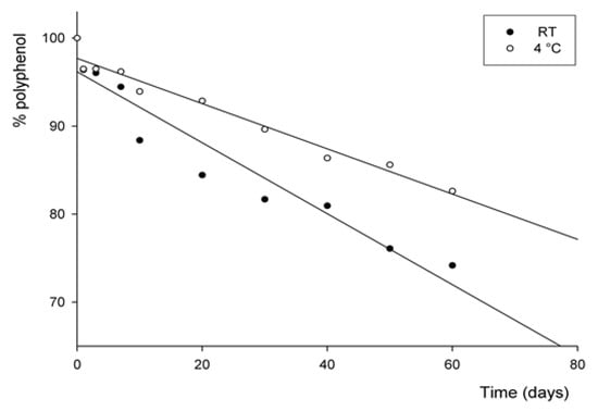 In this view, the stability of polyphenols was studied by comparing the total phenol contents at two temperatures, room temperature (RT) and cool temperature (4 °C), respectively. The experiments were carried out at two temperatures, storing the samples of fortified seawater for up to 60 days. Table 2 and Figure 2 show the results obtained, and, moreover, the parameters of the kinetic reactions are provided in Table 3.