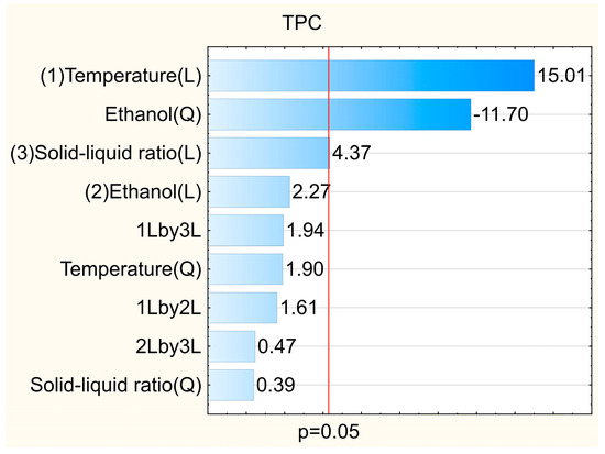 The temperature was the most relevant parameter, as shown in the Pareto diagram (Figure 1). Its linear effect was significant and positive. In this way, higher temperatures favor the solubility of phenolic compounds and decrease the viscosity of the extraction system, leading to a better extraction yield [16,30]. Notably, this behavior was also observed for the antioxidant capacity of the extracts regardless of the method used (Table 1, Figure S1).