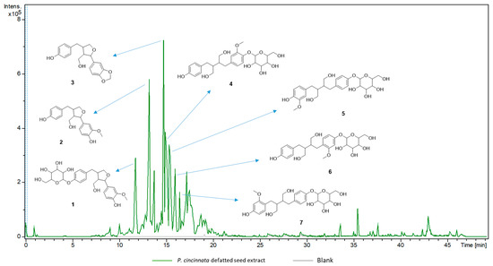 Base peak chromatogram (UPLC–MS/MS) in negative ionization mode of Passiflora cincinnata defatted seeds extract and the respective lignans (1–7) annotated for base peaks. The diglycosylated lignan 8 (Figure 4) is overlapped with the major ion signal at m/z 327.1280.