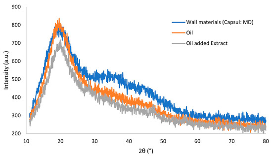 Figure 5 shows the diffractograms obtained for the wall material and P. cincinnata oil microencapsulated with and without antioxidant extract.