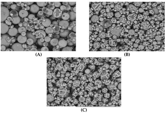 Micrograph of microparticles containing Passiflora cincinnata seeds oil (A); microparticles containing Passiflora cincinnata seeds oil plus antioxidant extract (B); microparticles of wall material only (C), visualized by MEV.