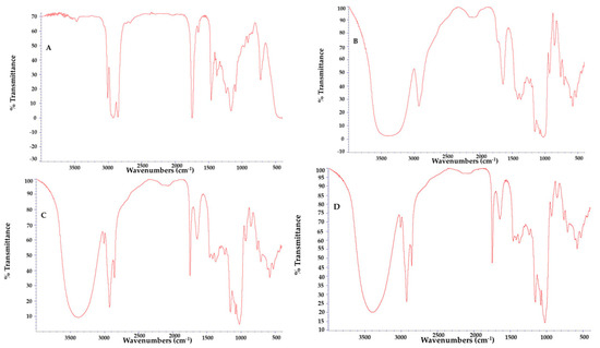 FTIR spectra of Passiflora cincinnata seeds oil (A) wall material (B) microparticles containing Passiflora cincinnata seeds oil and antioxidant extract (C) microparticles containing Passiflora cincinnata seeds oil (D).