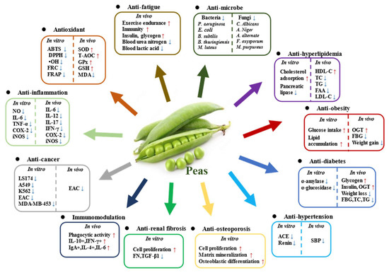 Biological activities of pea and its bioactive components. Pea and its bioactive components possess various health benefits in vitro and in vivo, such as antioxidant, anti-inflammatory, immunomodulatory, anti-cancer, anti-hypertensive, anti-obesity, anti-diabetic, anti-hyperlipidemia, anti-fatigue, antimicrobial, anti-osteoporosis, and anti-renal fibrosis effects. A594, lung carcinoma; ABTS, 2,2 azinobis 3-ethylbenzo-thiozoline-6-sulfonic acid; ACE, angiotensin I-converting enzyme; COX-2, cyclooxygenase-2; DPPH, 2,2-Diphenyl-1-picrylhydrazyl; EAC, Ehrlich ascites carcinoma; FAA, free amino acid; FBG, fasting blood glucose; FN, fibronectin; FRAP, ferric reducing antioxidant power; FRC, ferric ion-reducing capacity; GPx, glutathione peroxidase; GSH, glutathione; HDL-C, high-density lipoprotein cholesterol; IFN-γ, interferon-gamma; IgA+, immunoglobulin class A+; IL, interleukin; iNOS, inducible nitric oxide synthase; K562, myelogenous leukemia; LS174, human colon denocarcinoma; LDL-C, low-density lipoprotein cholesterol; MDA, malondialdehyde; MDA-MB-453, breast carcinoma; NO, nitric oxide; OGT, oral glucose tolerance; ·OH, hydroxyl radical; SBP, systolic blood pressure; SOD, superoxide dismutase; T-AOC, total antioxidant capacity; TC, total cholesterol; TG, triglyceride; TGF-β, transforming growth factor beta; TNF-α, tumor necrosis factor α.
