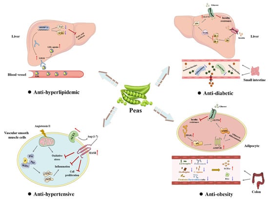 Metabolic syndrome (MS) is a group of clinical syndromes characterized by hypertension, dyslipidemia, obesity, and hyperglycemia. Many in vitro and in vivo experimental results have shown that pea and its components are effective in regulating various metabolic disorders (Figure 3).