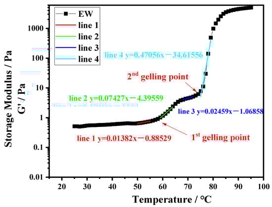 Dynamic rheology was applied to evaluate the gelation characteristics of the protein systems. Ten-percentage-by-weight protein suspensions of PPI, EW, and PPI-EW at different weight ratios (75/25, 50/50, and 25/75) were prepared at pH 7.5 and 9.0. Subsequently, each sample was loaded into a rheometer MCR 302e (Anton Paar, Graz, Austria) equipped with a plate–plate geometry (50 mm diameter). Approximately 1 mL of the protein suspension was transferred to the lower plate of the rheometer. The upper plate was lowered to give a gap width of 1 mm. A thin layer of light mineral oil was added to the well of the upper plate geometry and a solvent trap cover was used to prevent sample drying during heating. The following heating protocol was used. Samples were first equilibrated at 25 °C for 3 min, then heated under 1% shear strain and 1 Hz of frequency over a temperature range of 25–95 °C at a rate of 2 °C/min (heating ramp). Rheological data as storage modulus (G′) and loss modulus (G″) were collected for every degree change during heating. The thermal gelation profile of EW, i.e., G′ as a function of temperature, obtained at pH 9.0 was chosen as a typical curve to illustrate how the data were analyzed (Figure 1). In this case, we observed two inflection points at ~58 and ~75 °C, respectively, where the G′ values rose sharply and diverged significantly from the loss modulus values (G′ >> G″). The points on both sides of one inflection point were fitted by linear models and the intersection of the respective straight lines was considered as the gelling temperature or gelling point as represented in Figure 1. Runs and analyses were performed in triplicate for each sample.