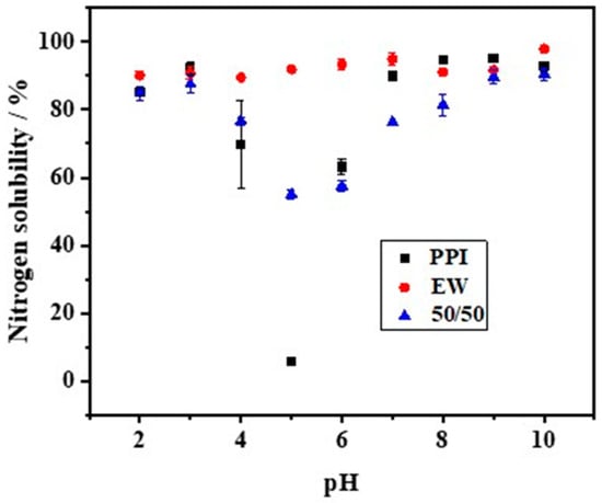 Nitrogen solubility of PPI, EW, and PPI-EW mixture at the 50/50 weight ratio in 0.1 M NaCl.