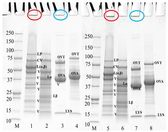 SDS-PAGE profile of 10 wt% PPI suspension and EW when prepared at pH 7.5 and 9.0. The samples on lanes 2, 4, 6, and 8 were treated under reducing conditions with SDS + DTT reagents. Circles in red and blue at the top of the bands indicate the aggregates of PPI and egg white, respectively. Lanes 1–4 at pH 7.5, lanes 5–8 at pH 9.0; lane M: molecular weight (Mw) markers; lanes 1–2, and 5–6: PPI; lanes 3–4, and 7–8: EW. LP, lipoxygenase; L (α, β), legumin; CV, convicilin; Lα, legumin acid subunit; Lβ, legumin basic subunit; V, vicilin; OVA, ovalbumin; OTA, ovotransferrin; LYS, lysozyme.