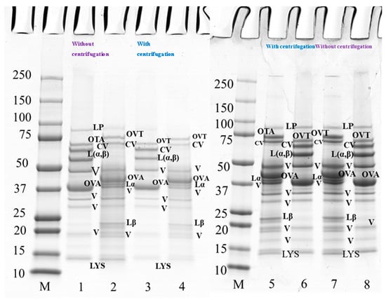 The polypeptide profile of PPI-EW mixtures at a weight ratio of 50/50 at pH 7.5 (lanes 1–4) and 9.0 (lanes 5–8) under reducing and non-reducing conditions with and without centrifugation is shown in Figure 4. Major protein components of PPI and EW were found under non-reducing conditions, such as vicilin (around 50 kDa, 20–37 kDa, 19 kDa), convicilin, legumin (Lαβ), ovalbumin, ovotransferrin, and lysozyme (Figure 4, lanes 1 and 8). When comparing the bands under reducing conditions between Figure 4 (lanes 2 and 7) and Figure 3 (lanes 2 and 4 and lanes 6 and 8 for PPI and EW, respectively), no band disappeared. However, regarding supernatant samples after centrifugation, the bands of vicilin at ~19 kDa, lipoxygenase and lysozyme (Figure 4, lanes 3 and 4), faded at pH 7.5 (Figure 4, lane 3) but not at pH 9 (Figure 4, lane 5) compared to initial mixture samples (Figure 4, lanes 1 and 2). This would suggest the contribution of these proteins in the insoluble part of the mixture in agreement with the observed loss of protein solubility around this pH (Figure 2, Table 1). In particular, some pea protein polypeptides could interact with lysozyme, which is positively charged around neutral pH, to form insoluble complexes []. Interestingly, this did not occur markedly at pH 9.0 (Figure 4, lane 5–8) when lysozyme was less positively charged at a closer pH to its pI (10.7).