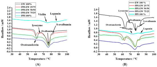 Typical DSC thermograms for PPI, EW, and PPI-EW at different weight ratios at pH 7.5 (A) and 9 (B), respectively.