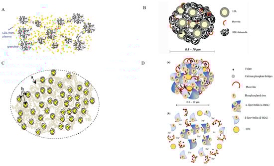 (A) Structure of egg yolk system by [12]; (B) schematic model of egg yolk granule proposed by [7]; (C) components of the microstructure of egg yolk: (a) granule and (b) LDL in plasma proposed by [15]; and (D) representation of the model of (a) native and (b) disrupted egg yolk structure proposed by [15].