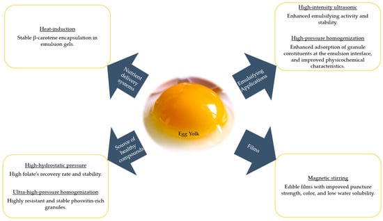 This sub-section summarizes physical treatments of egg yolk granules, the objective behind the treatment, highlighted results, and possible effects on its functionality, as described in Table 2. Mechanical treatments such as high-intensity ultrasonic (HIU) could improve the functionality (emulsification, foaming, and gel properties) of egg yolk granules by altering the aggregation of the egg yolk components and the partial dissociation of the calcium phosphate bridge, which enables particle size reduction [5]. In the study of Naderi et al. [39] HHP treatment did not modify the folate or the lipid composition of the granules, allowing maximum recovery of the folate content. Gaillard et al. [6] also revealed that UHPH treatment seems severe to the granule structure but the phosvitin–HDL complex showed very high resistance, and their composition was unaffected by the process. The treatment of granule fractions at 400 MPa for 5 min has proven effective in the extraction of the water-soluble B vitamin (5-MTHF) using high hydrostatic pressure. This shows that under mechanical treatment, the functionality of the treated egg yolk granules is improved.