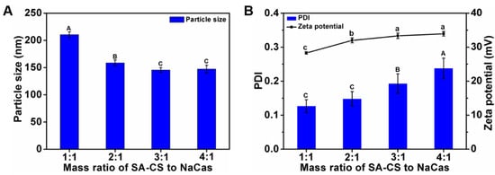Effects of mass ratio of SA-CS to NaCas on particle size (A); PDI and zeta potential (B) of composite nanoparticles. The different letter represents a significant difference of different concentrations under the same molecular weight compared with the control group (p < 0.05).