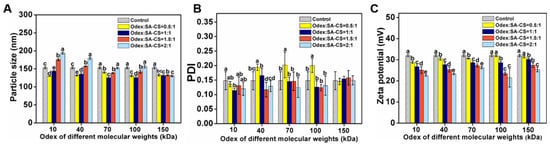 Effect of the proportion of Odex addition prepared from each molecular weight on particle size (A); PDI (B); and zeta potential (C) of NPOs. The different letter represents a significant difference of different concentrations under the same molecular weight compared with the control group (p < 0.05).