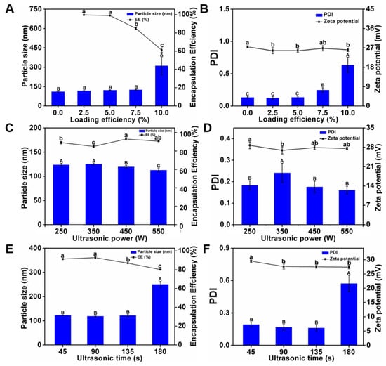 Characteristics of Cur-NPO with different curcumin loading efficiency: (A) particle size and encapsulation efficiency; (B) PDI and zeta potential; Characteristics of Cur-NPO with different ultrasonic power: (C) particle size and encapsulation efficiency; (D) PDI and zeta potential; Characteristics of Cur-NPO with different ultrasonic time: (E) particle size and encapsulation efficiency; (F) PDI and zeta potential. The molecular weight of Odex is 150 kDa. The different letter represents a significant difference of different concentrations under the same molecular weight compared with the control group (p < 0.05).