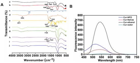 Characterization of nanoparticles: (A) FT-IR spectrum of individual biopolymer and various nanoparticles prepared under different conditions. a. CS; b. SA-CS; c. SA; d. NaCas; e. Curcumin; f. dextran (150 kDa); g. Odex (150 kDa); h. NPO (150 kDa) without ultrasound; i. NPO (150 kDa); j. Cur-NPO (150 kDa). (B) The intrinsic fluorescence property of free curcumin and Cur-NPO (150 kDa).