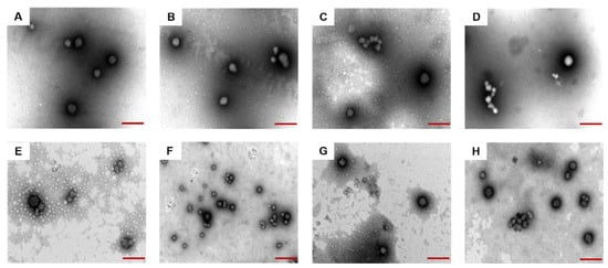 The morphology of composite nanoparticles prepared by Odex crosslinking with the same concentration but with different molecular weights and Cur-NPO were obtained through TEM analyses. All the composite nanoparticles exhibited similar spherical morphologies (Figure 6A–H). The addition of Odex and ultrasonication treatment had little effect on these morphologies. The TEM-determined particle size of all samples was less than the DLS-measured size; this was probably due to dehydration and shrinkage during the preparation. These findings are similar to those of Zhang et al. (Y.L. Zhang, Dou, and Jin 2010) [].