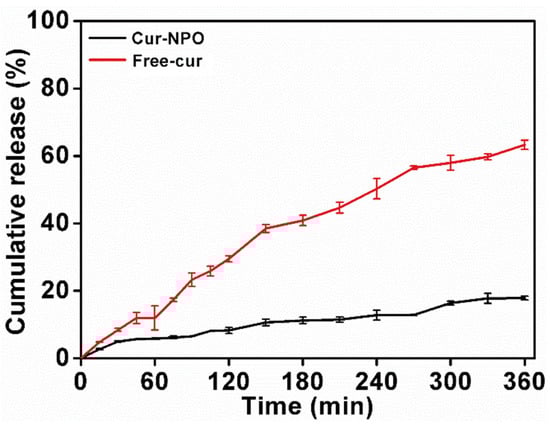 Free curcumin and Cur-NPO were controllably released in SGF and SIF. Free curcumin was rapidly released in SGF and SIF (Figure 7), with a final release rate of 63.3%. A previous study reported continuous release of free curcumin, with a final release rate of 68.4% []. Yang et al. studied that the total amount of Cur released after six hours was 70.04 %, and the amount of Cur released under SIF (43.99 %) was significantly greater than that under SGF (26.05 %) []. However, the final release rate of Cur-NPO was 17.9%, much less than that of free curcumin (63.3%). The results showed that Cur-NPO had a better retention effect. This was likely because curcumin was encapsulated within NPO nuclei by hydrophobic interactions, and its release was greatly limited by the dense structure of composite nanoparticles. Rodriguez et al. (2019) also reported a slow release for maize protein/NaCas complex nanoparticles [].