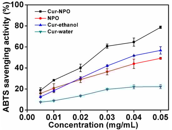 The antioxidant activities of Cur-NPO, NPO (without curcumin), and controls (curcumin in water and aqueous ethanol) were determined via ABTS free-radical clearance analysis (Figure 8). With increasing curcumin concentration, from 0.005 to 0.050 mg/mL, the clearance rate of free radicals from Cur-NPO (compared to curcumin in water) increased. The low solubility of curcumin possibly limited the number of dissolved molecules present to react with free radicals [], so the antioxidant activity was only 22.3% at the highest curcumin concentration. However, the antioxidant activity of Cur-NPO in water was up to 78.7% greater than controls of curcumin in water and aqueous ethanol. This is attributable to NPOs’ improved dispersion of curcumin in water, resulting in greater radical scavenging [,,,].