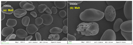 Malt and rice starch samples were gold-coated to increase their conductivity, and their particle sizes were evaluated under a scanning electron microscope (SEM-3000; Hitachi Ltd., Tokyo, Japan) at 1000× and 2000× magnifications.