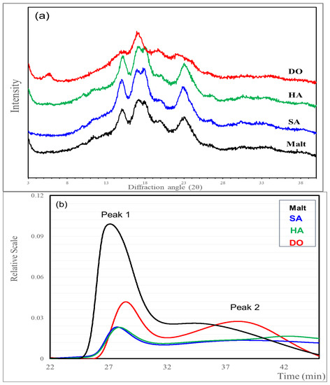 Crystallinity and chromatograms of starch isolated from Korean malt and three rice varieties. (a) X-ray diffraction patterns of malt and rice starches from Korean cultivars; (b) High-performance size exclusion chromatography chromatogram of malt and rice starches from Korean cultivars; Peak 1 (amylopectin), Peak 2 (amylose). Malt, Heugho malt; SA, Samgwang rice; HA; Hangaru rice; DO, Dodamssal rice.