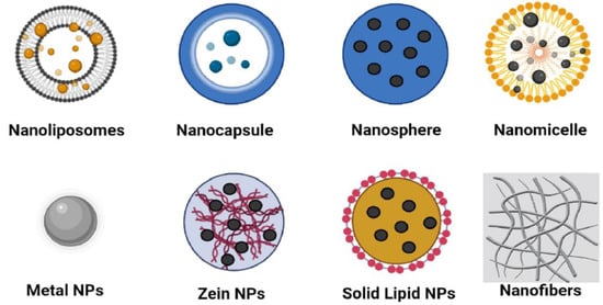 A schematic representation of some nanostructures studied in the field of food science is presented in Figure 1. The suitability of a nanostructured system is related to the chemical properties of the antimicrobial compound, the selected nanostructure and the nature of the food or material where it is intended to be used; e.g., polymeric nanocapsules, which are formed by an oily core surrounded by a polymer layer, are suitable to load and deliver hydrophobic substances, and nanoliposomes, formed by a phospholipid bilayer with an aqueous core, can entrap and deliver both hydrophobic and hydrophilic molecules []. Recently, inorganic nanoparticles (NPs) have been demonstrated to have antibacterial activity against a wide range of microorganisms, including foodborne pathogens. Silver, copper, gold, titanium oxide and zinc oxide NPs, are associated with high efficacy at low concentrations and can be used to create antibacterial materials []. However, it is important to note that some nanostructures could present adverse biological effects to the consumer, and thus their safety must be assessed, evaluating important characteristics, such as concentration, dose, exposure route and duration, in addition to NP physiochemical properties, in order to assess their toxicity prior to use in the food industry [,].