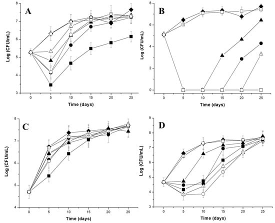 Growth curves of L. monocytogenes in whole milk (A) or skim milk (B) and a cocktail of Listeria strains in whole milk (C) or skim milk (D) during incubation at 7 °C. The cocktail of Listeria strains contained a mixture of L. monocytogenes 4b, L. innocua 6a, Listeria sp. Str1 and Listeria sp. Str2. Viable cell counts of the control (filled rhombus), PC liposomes (filled circle), PC–pectin (filled square), PC–polygalacturonic acid (filled triangle), free lysozyme (open square), free nisin (open triangle) and free lysozyme–nisin (open circle) were evaluated. (Reproduced from [] with permission).