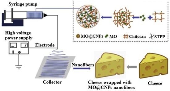 Two cheese varieties, a rennet-curd (gouda) and an acid-curd (quark) cheese, were tested with the addition of furcellaran nanocomposite film with silver nanoparticles by Pluta-Kubica et al. []. The cheese quality was examined, indicating that the use of the film improved the microbiological quality of cheeses during storage, slowing down and inhibiting the growth of yeast in gouda and quark, respectively. In addition, regarding gouda, an inhibitory effect of this film on mold count was also observed. In another study, Lin and collaborators [] developed a food packaging against L. monocytogenes and S. aureus on cheese (Figure 3). For this, fabricated moringa-oil-loaded chitosan nanoparticles (MO@CNPs) were embedded in gelatin nanofibers by the ionic crosslinking method. The sensory quality of cheese was not affected by the packaging, and MO@CNP nanofibers showed high antibacterial activity when applied on the cheese at 4 °C and 25 °C for 10 days.