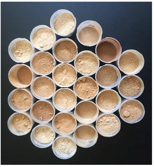 The color of the carob flour was determined using a Minolta CR-410 Chroma Meter (Minolta, Osaka, Japan) equipped with a diffusion illumination 0° viewing angle geometry and the color space XYZ, Yxy, L*a*b*, Hunter, L*C*h, Munsel as the default []. The color component L* (lightness), which ranges from 0 = black to 100 = white, was recorded as the variable expressing the darkness of carob flour samples (Figure 1).