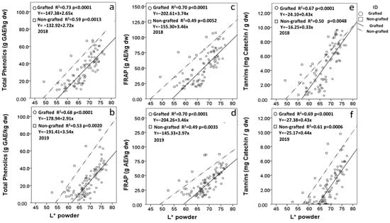 Pearson correlation of total phenolics (a,b), FRAP (c,d), and tannins (e,f) with flour lightness (L*) of non-grafted and grafted source material harvested in two constitutive years (2018 and 2019).