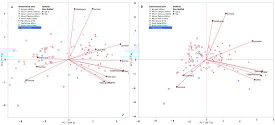 PCA analysis of carob flour compositional and qualitative traits (L*, fructose, glucose, sucrose, total sugars, DPPH, FRAP, total phenolics, tannins, organic acids) for the entire sampled population, including genotype, sampling area, and corresponding altitudinal range, for two consecutive years 2018 (a) and 2019 (b).