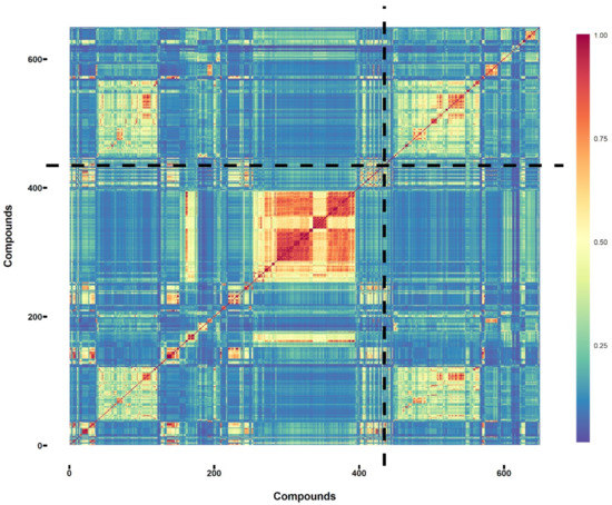 Similarity matrix of the sweet/non sweet compounds used for binary classification (Table S1) calculated based on Tanimoto correlation coefficient. The sweet and non-sweet compounds were separated by the dash lines (the first 435 compounds were sweet, and the other 214 compounds were non-sweet).