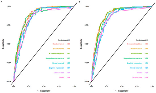 The receiver operating characteristic (ROC) curve analysis for evaluating the performance of the built machine learning classification models (logistic regression, decision trees, random forest, multivariate adaptive regression splines, boosted trees, neural network, K-nearest neighbor, and support vector machine). The area under curve (AUC) values listed in each figure were calculated based on the unsmoothed ROC curve. (A) The ROC curve for the built machine learning classification models with 91 descriptors as the input. (B) The ROC curve for the built machine learning classification models with top 10 descriptors selected through the variable importance analysis as the input.