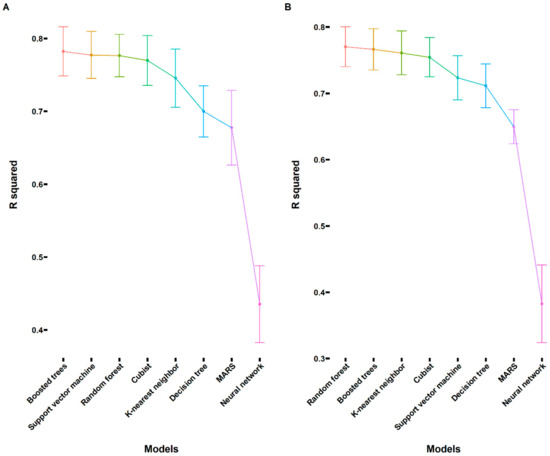 The adjusted R2 values for evaluating the performance of the built machine learning regression models (cubist, decision trees, random forest, multivariate adaptive regression splines, boosted trees, neural network, K-nearest neighbor, and support vector machine). (A) The adjusted R2 values for the built machine learning classification models with 91 descriptors as the input. (B) The adjusted R2 values for the built machine learning classification models with top 10 descriptors selected through the variable importance analysis as the input.