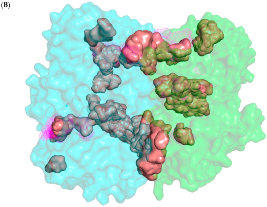 (A) The homology model of the “Venus Fly Trap” (VFT) domain of the human sweet taste receptor T1R2-T1R3. The cyan color represents the VFT domain of the T1R2 and the green color represents the VFT domain of T1R3. (B) All the binding sites of the sweet and non-sweet compounds (Table S1) in the VFT domain of T1R2-T1R3. The pink surface and magenta mesh represent all the binding sites of sweet and non-sweet compounds in the VFT domain of the T1R2-T1R3, respectively.