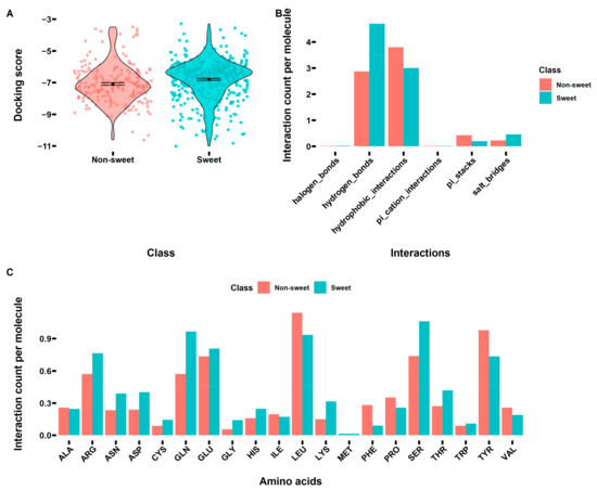 The interactions between the sweet/non-sweet compounds (Table S1) and the VFT domain of T1R2-T1R3. (A) The docking scores of the sweet/non-sweet compounds (Table S1). (B) The interaction (hydrogen bonds, hydrophobic contacts, π-stacking, π-cation interactions, salt bridges, water bridges, and halogen bonds) counts per molecule between the sweet/non-sweet compounds (Table S1) and the VFT domain of T1R2-T1R3. (C) The interaction counts per molecule of the involved amino acids in the VFT domain of T1R2-T1R3.