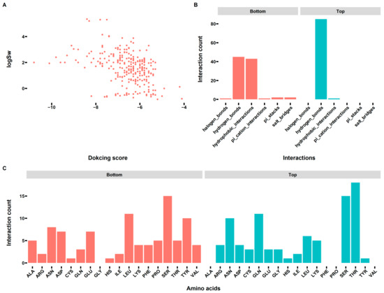 The interactions between the sweet compounds (Table S2) and the VFT domain of T1R2-T1R3. (A) The correlation between the sweetness of the investigated compounds (Table S2) and docking scores. (B) The interaction (hydrogen bonds, hydrophobic contacts, π-stacking, π-cation interactions, salt bridges, water bridges, and halogen bonds) counts per molecule between the top 10 and bottom 10 compounds (Table S2) and the VFT domain of T1R2-T1R3. (C) The interaction counts per molecule of the involved amino acids in the VFT domain of T1R2-T1R3 for the top 10 and bottom 10 compounds.