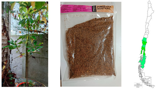 Fruits of Drimys winteri J.R. Forst. and G. Forst. var. chilensis (DC.) A. Gray (family Winteraceae) were collected manually from the months of March–April of the year 2021 in Valdivia, the capital city of the Los Ríos region, near the road on the way to Oncol Park, Chile. The mature fruits were washed, dried at room temperature to obtain pimienta mapuche (Mapuche pepper, Figure 1), and then stored in a dark and cool place sealed without air at an ambient temperature (25 °C). A voucher specimen was placed in the “Laboratorio de Productos Naturales of the Universidad Austral de Chile” (voucher number DW-7-11-21). A total of 5 g of milled canelo fruits were extracted with 20 mL of ethanol: water 1:1 v/v and the solvent evaporated in vacuo at 45 °C and the remaining water lyophilized to yield 488 mg of a brown extract. The extract was kept at −80 °C in an ultra-freezer for further dissolution and analyses.