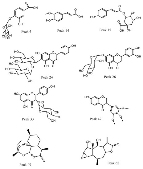Several O glycosyl flavonoids were detected, together with some of their aglycones, most of them with a myriad of biological activities [35]. Peak 26 was identified as the flavanone eriodictyol 7-O-hexoside (C21H21O11−), peak 28 as myricetin, peak 31 as sophoraflavonoloside (C27H29O16−), peak 33 as isoquercitrin and peaks 34, 37, and 43 as kaempferol derivatives: kaempferol-3-O-rutinoside (C27H29O15−), kaempferol 3-O-galactopyranoside (C21H19O11−), and kaempferol 3-O-pentoside (C20H17O10−). Peaks 38–40, 42, 45, 46, 52–55, and 57, 6061, and 65 were assigned as: avicularin, taxifolin, isorhamnetin 3-O-glucoside, luteolin 5-O-glucoside, diosmetin 7-O-beta-D-glucopyranoside, eriodictyol, fisetin, quercetin, isorhamnetin, kaempferol, diosmetin, cirsimaritin, and apigenin 7-O-methyl ether.